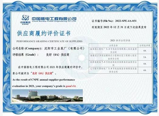 沈陽市工業(yè)泵廠(有限公司)獲得中國核電工程有限公司4A供應(yīng)商履約評價